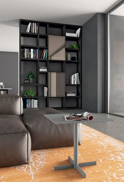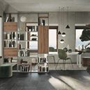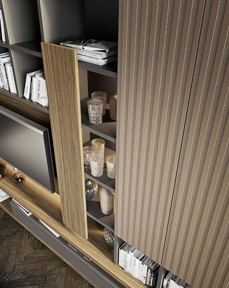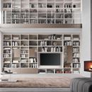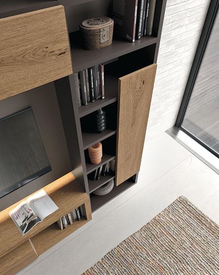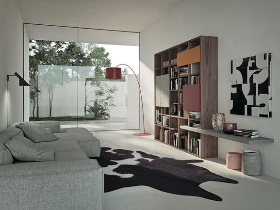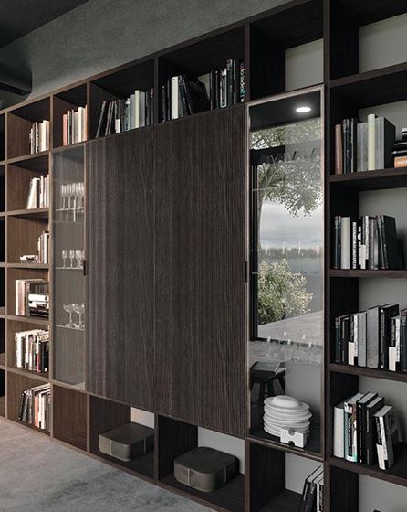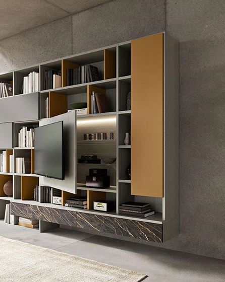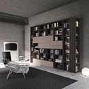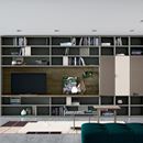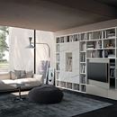 Fianchi, ripiani e pensili si combinano liberamente all’interno dei sistemi libreria, dando vita ad architetture da parete sempre diverse.